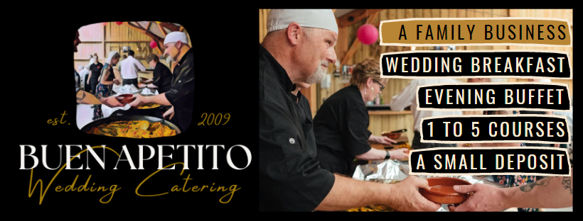 Buen Apetito Catering offer one level of service.... 'Relaxed dining' service, and this automatically includes staff mingling with and handing out canapes directly to your guests while they enjoy a welcome or post ceremony drink, our starters are placed directly on your guest tables for them to help themselves, our desserts are also placed directly on your guest tables. The main course will be served to your guests as they come to select their choice from up to four menu options in front of them, speedily and efficiently, then returning for seconds too! Yes. you heard this right, we like guests to eat well.